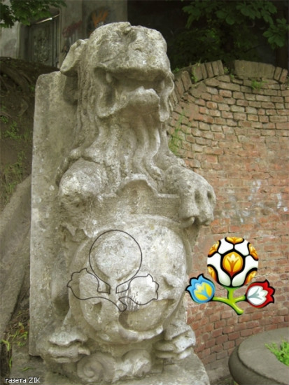 Львівські журналісти виявили на декоративній криничці з левами XVII ст. (вулиця Коперника) символи, схожі на логотип чемпіонату Європи з футболу 2012 року.