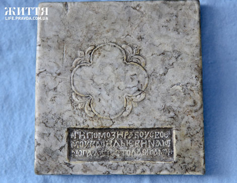Григорій Полюшко демонструє напис на зворотному боці знахідки «Господи, поможи рабу своєму Василію», написаний старослов'янською.