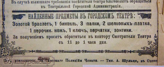 Найстаріший експонат витягли в кінці 90-х років з-під «французького фойє». Під час реставрації театру виявили ящик, в якому знаходився хліб, пляшка з вином і табличка — про те, що це заставна Оперного театру.