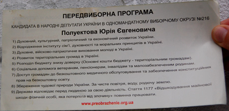 «У неділю, 7 жовтня, на території парафії св. княгині Ольги, що знаходиться на вулиці Вербицького у Києві, церковнослужителі по закінченні ранкової служби вручали прихожанам агітаційні матеріали із закликом голосувати на майбутніх виборах до Верховної Ради за Юрія Полуектова, що іде на вибори по мажоритарному округу № 216 у Дарницькому районі», — розповіла киянка Вікторія.