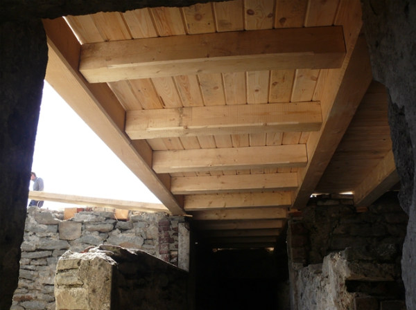 Потихеньку привозиться будматеріали, які робітники згромаджують у східних приміщеннях. Робітники витягають матеріали з допомогою мотузок.