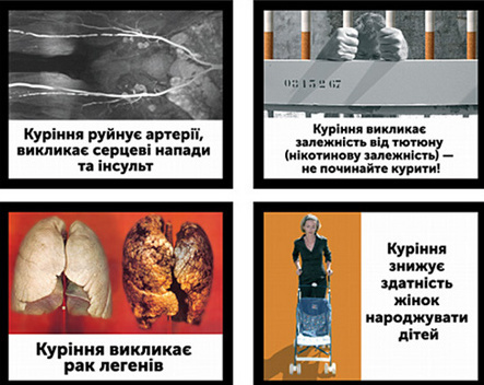 Крім того, зображення жіночого обличчя поряд з черепом буде доповнено словами: Куріння викликає старіння шкіри. Картинку з жінкою, яка везе порожню коляску буде доповнювати напис: Куріння знижує здатність жінок народжувати дітей та інші. Зображення наслідків хвороб, які вже впроваджені в 43 країнах світу, Україна запозичила у ЄС.