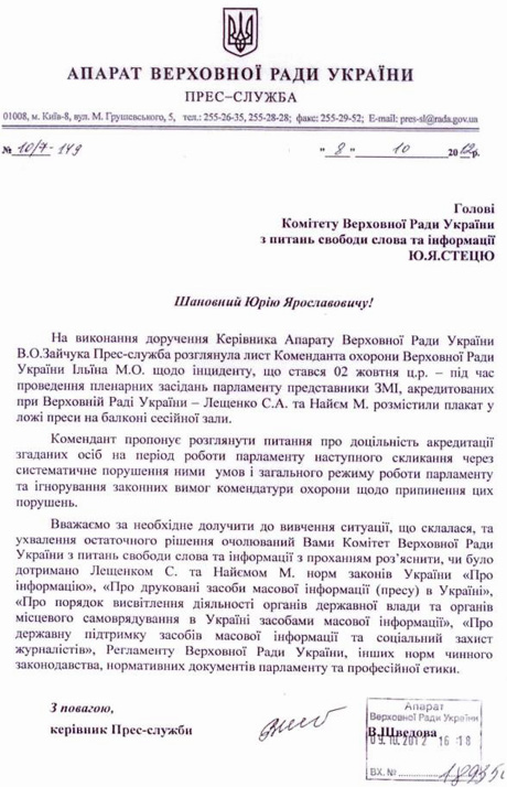 Апарат Верховної Ради просить Комітет з питань свободи слова розглянути питання про доцільність пропуску журналістів «Української правди» Сергія Лещенка та Мустафи Найема на засідання парламенту наступного скликання.