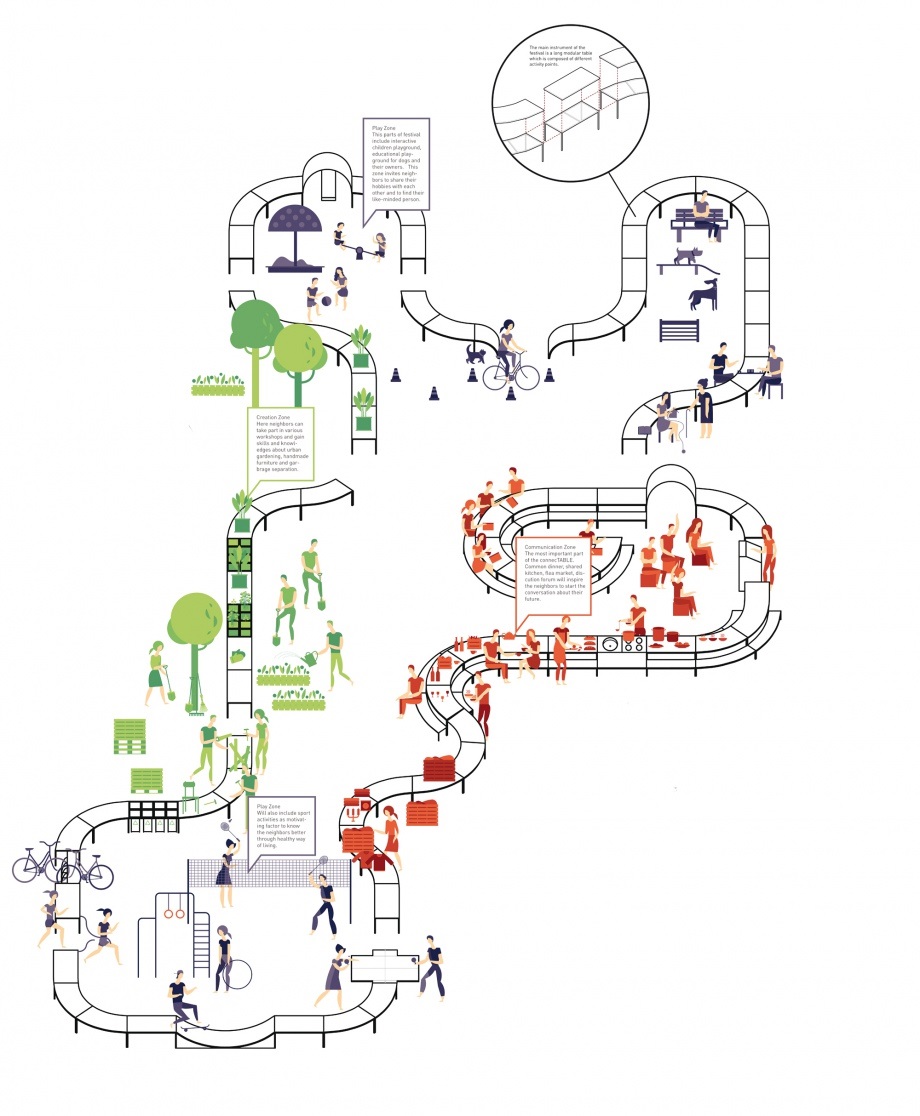 Стіл, за яким одночасно проводитимуть ігри та навчатимуть, стане приводом для налагодження взаємин між людьми. Під час фестивалю мешканці гратимуть ігри, навчаючись сусідству через елементарні речі: спільну вечерю, спорт, забави з дітьми, участь у гутірці та покращенні довкілля власними руками.