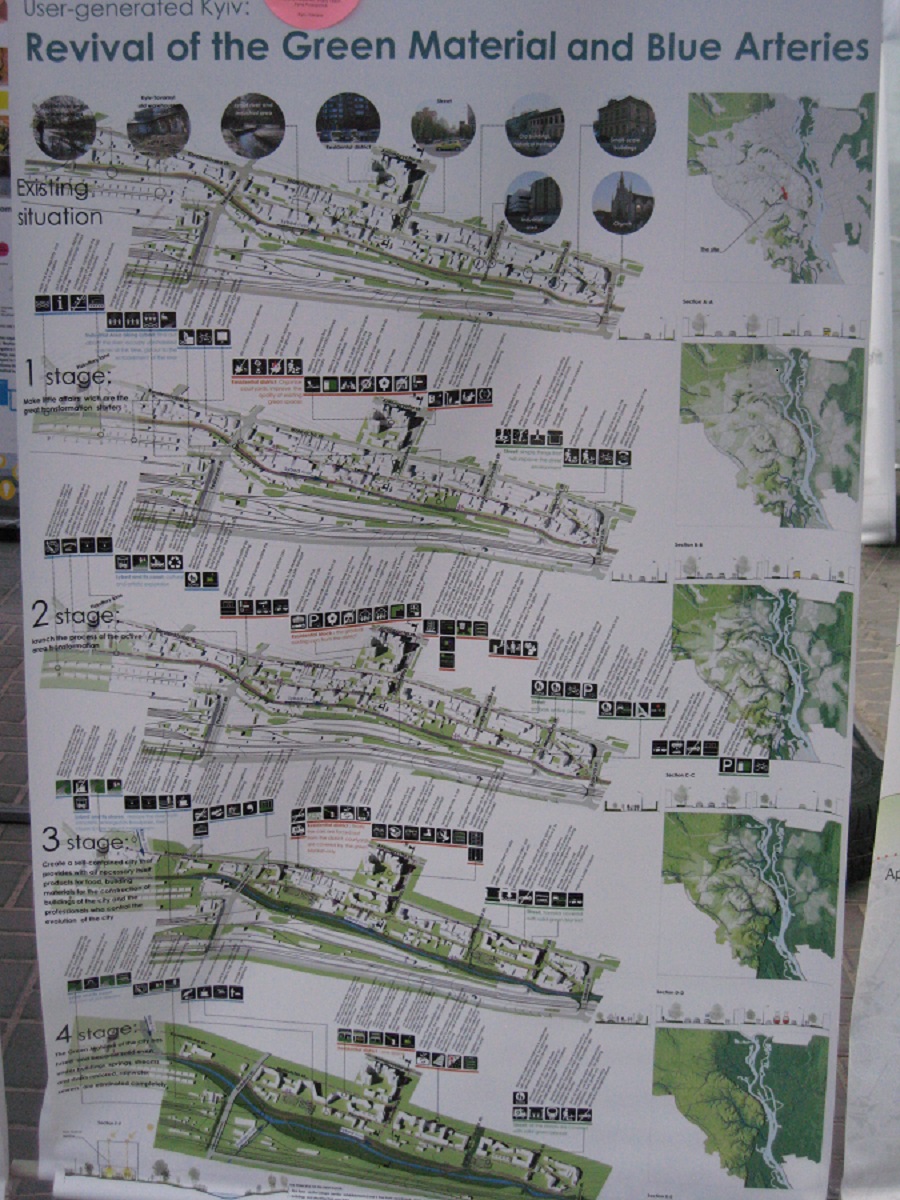 Загалом було виділено жилий квартал, вулицю та промислово-складську територію вздовж берегів річки, для яких розроблено сценарій трансформації на 4 етапи аж до повного відновлення зеленої тканини та голубої артерії.