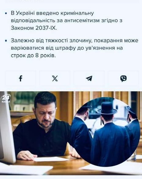 Підписання президентом Закону «Про внесення змін до статті 161 Кримінального кодексу України для реалізації положень Закону України «Про запобігання та протидію антисемітизму в Україні» — це ВАГОМА ДОПОМОГА російській пропаганді, яка споконвічно боролася з «українським націоналізмом і антисемітизмом».